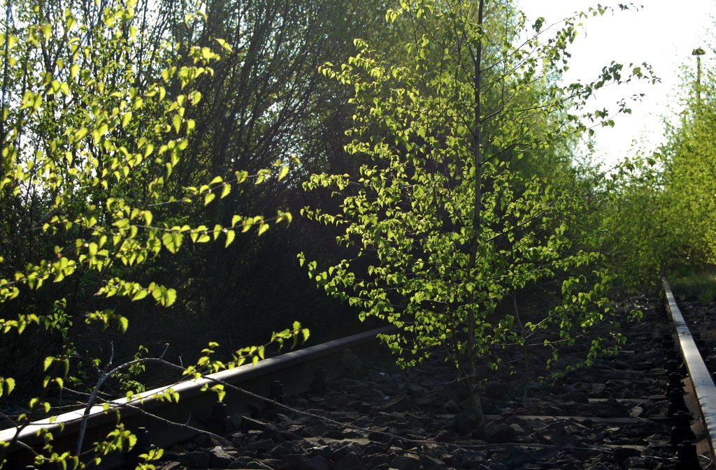 Auch auf dem früheren durchgehenden Hauptgleis sprießt die Vegetation. (18.04.2009)