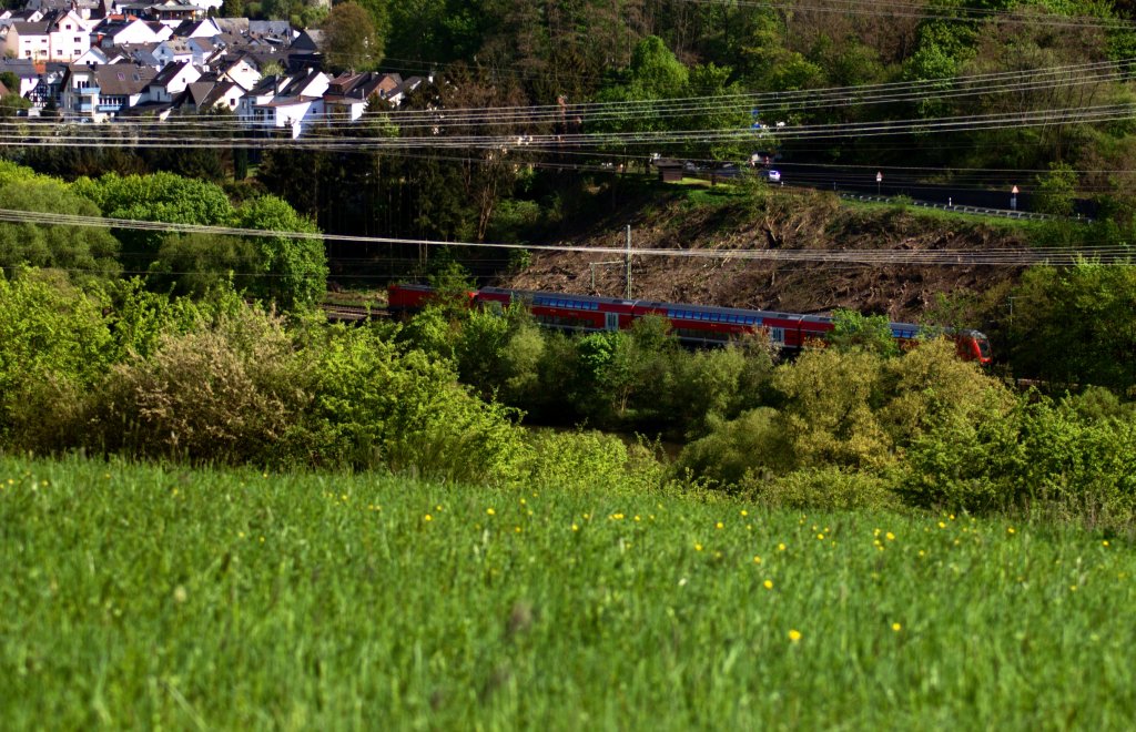 Doch zurück nach Limburg. Die Nicht-ICE-Züge nach Frankfurt benutzen zwischen Limburg und Eschhofen die Gleise der Lahntalbahn. Hier versucht eine Regionalbahn, sich kurz vorm Erreichen von Eschhofen vor der neugierigen Kamera des Fotografen zu verstecken. (19.04.2009)